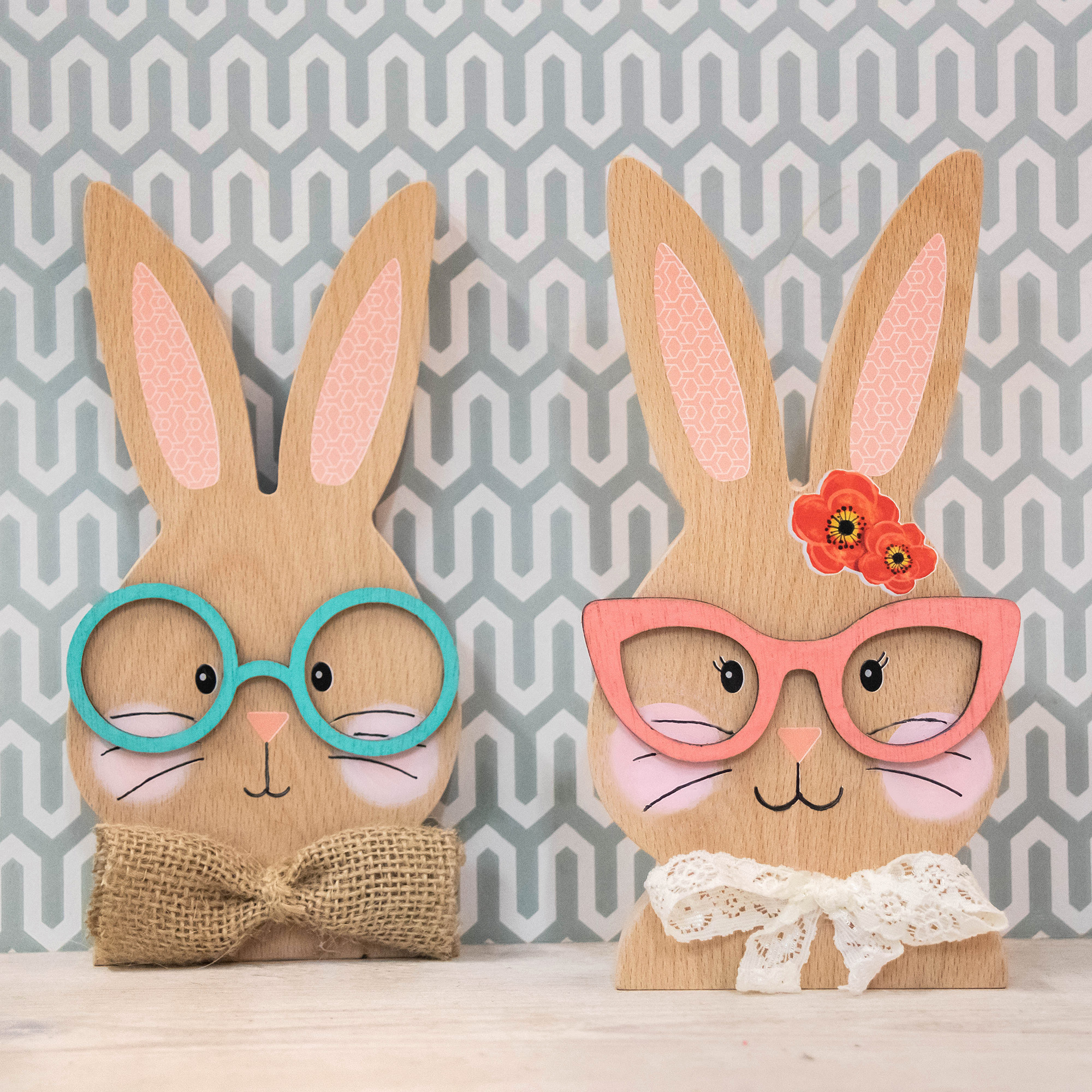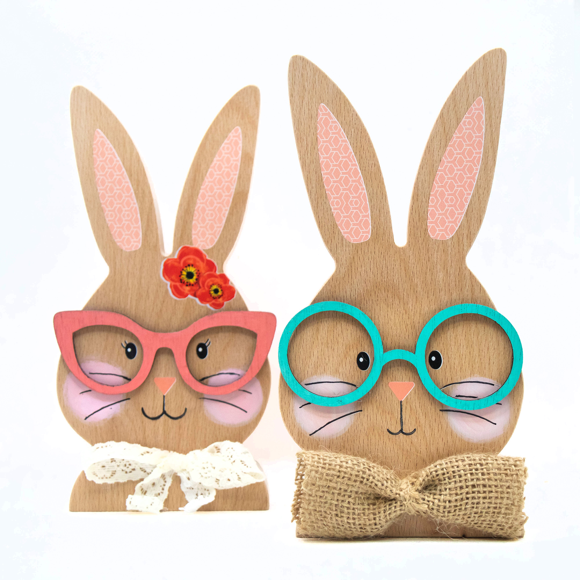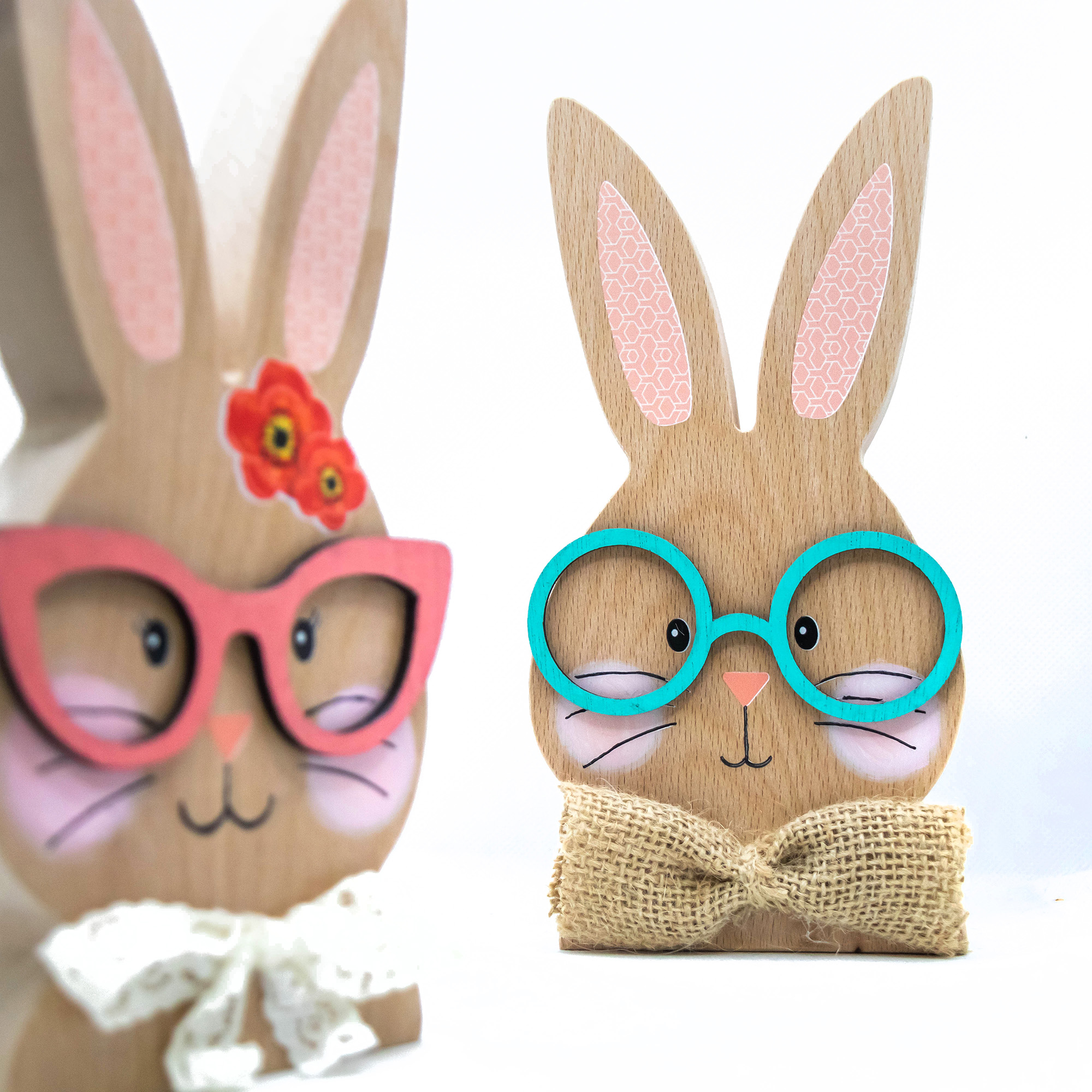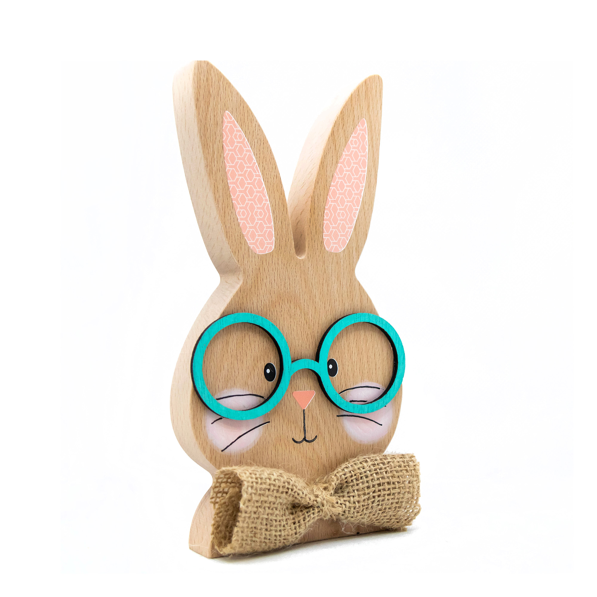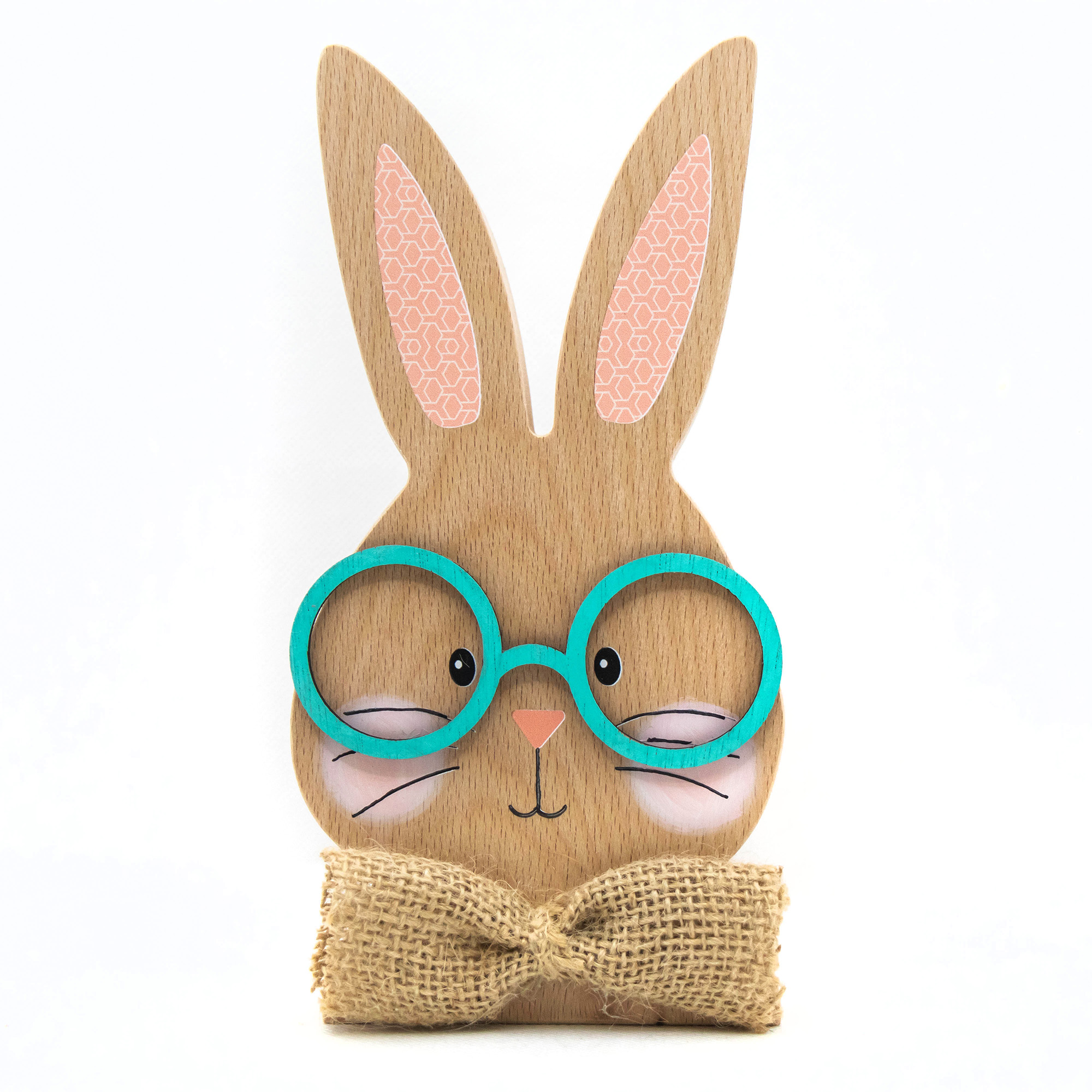 Ξύλινο κουνελάκι με γυαλιά. Διαθέσιμα δύο σχέδια – κορίτσι, αγόρι.