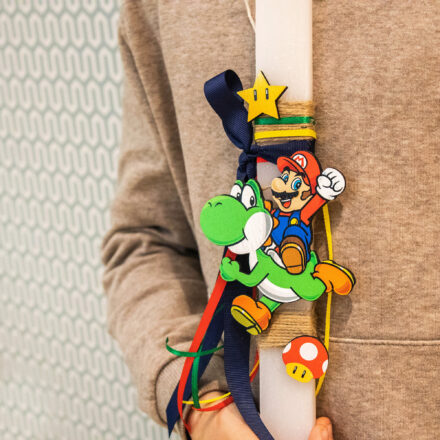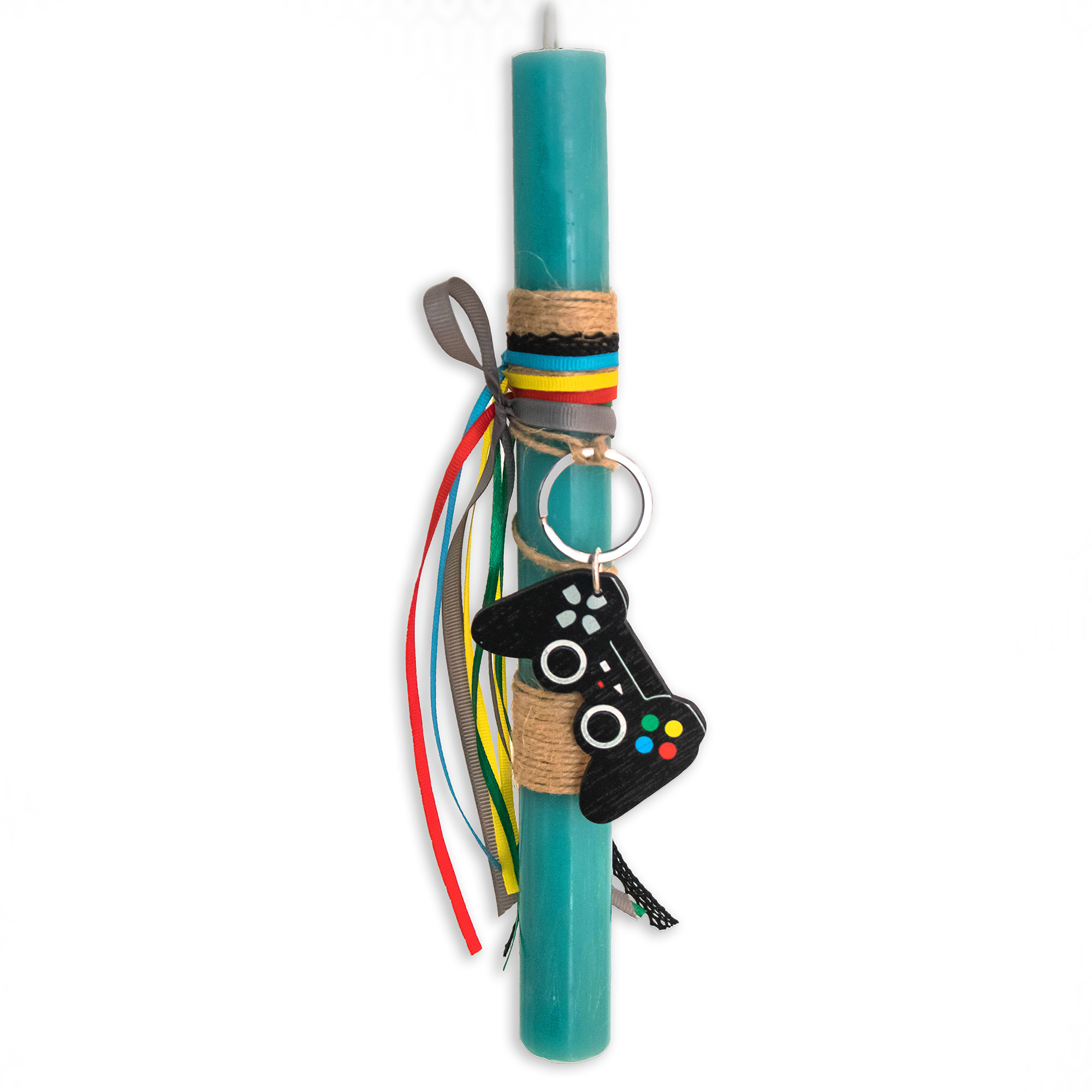 Λαμπάδα με βεραμάν κερί και ξύλινο μπρελόκ playstation.