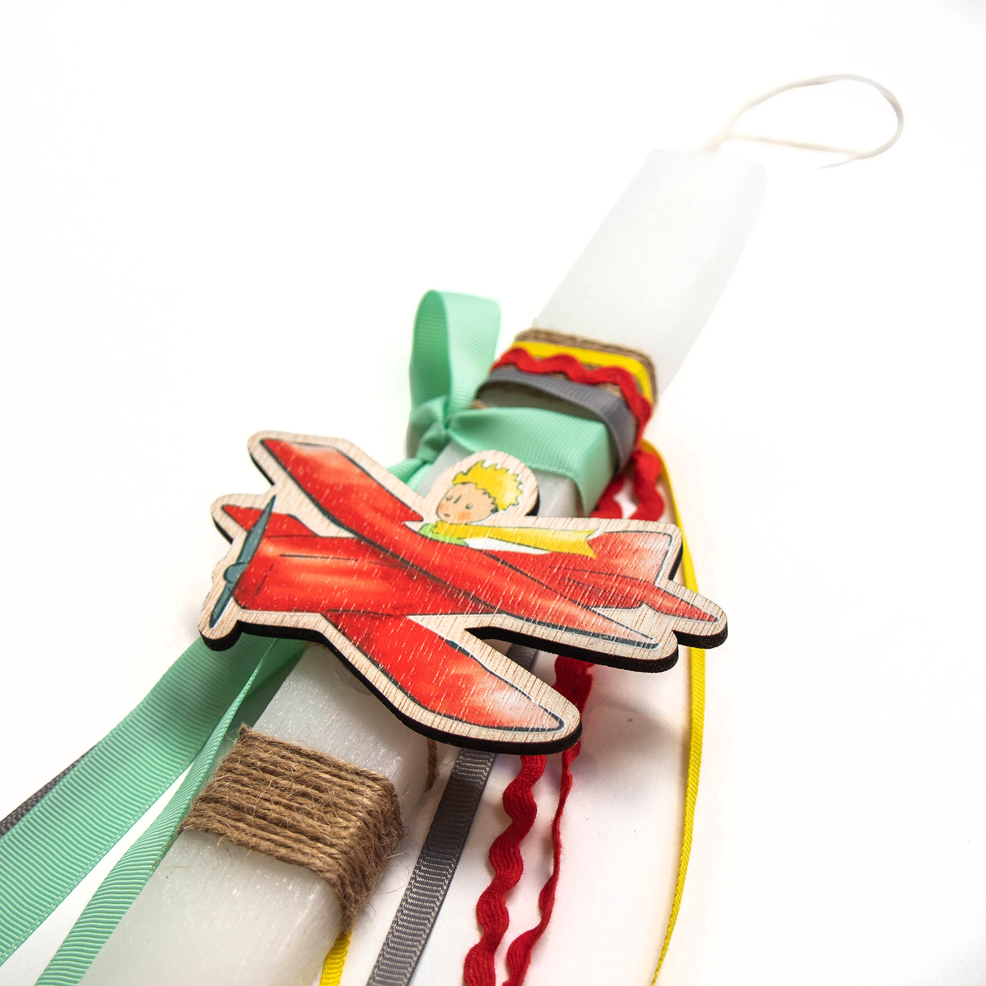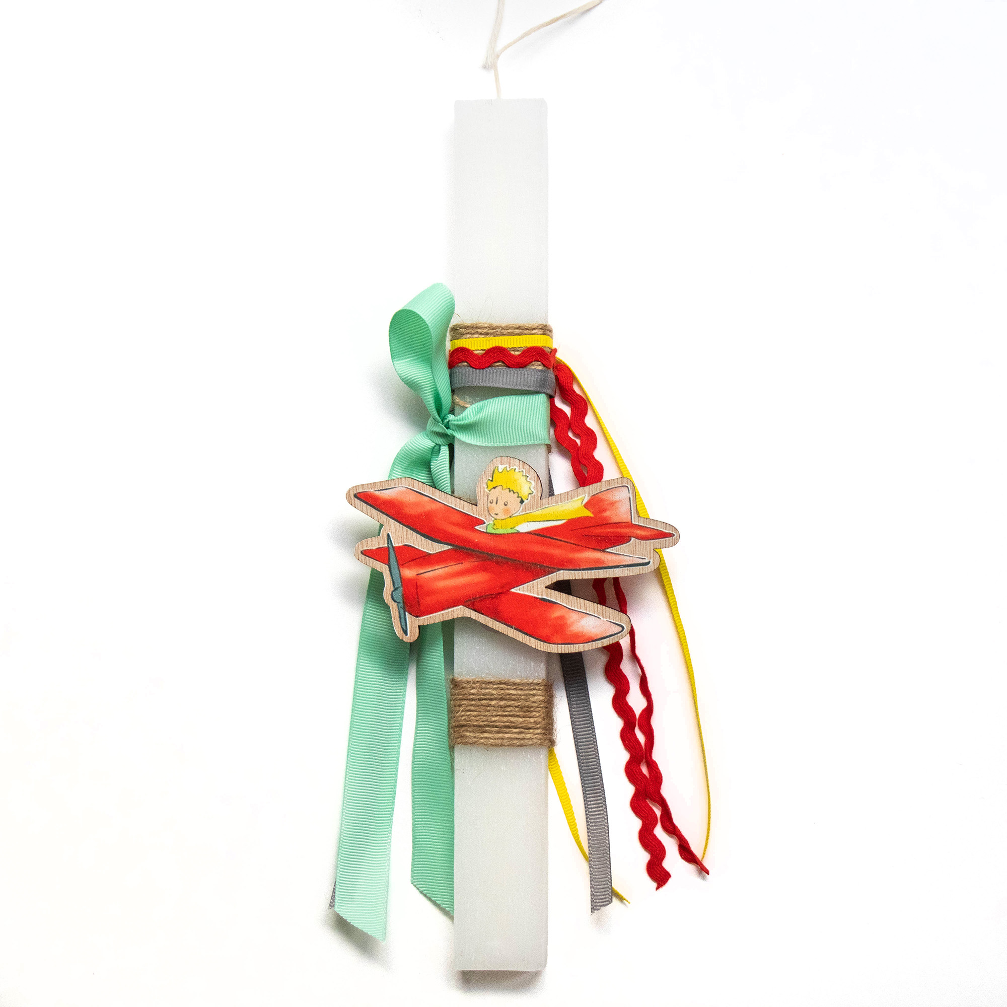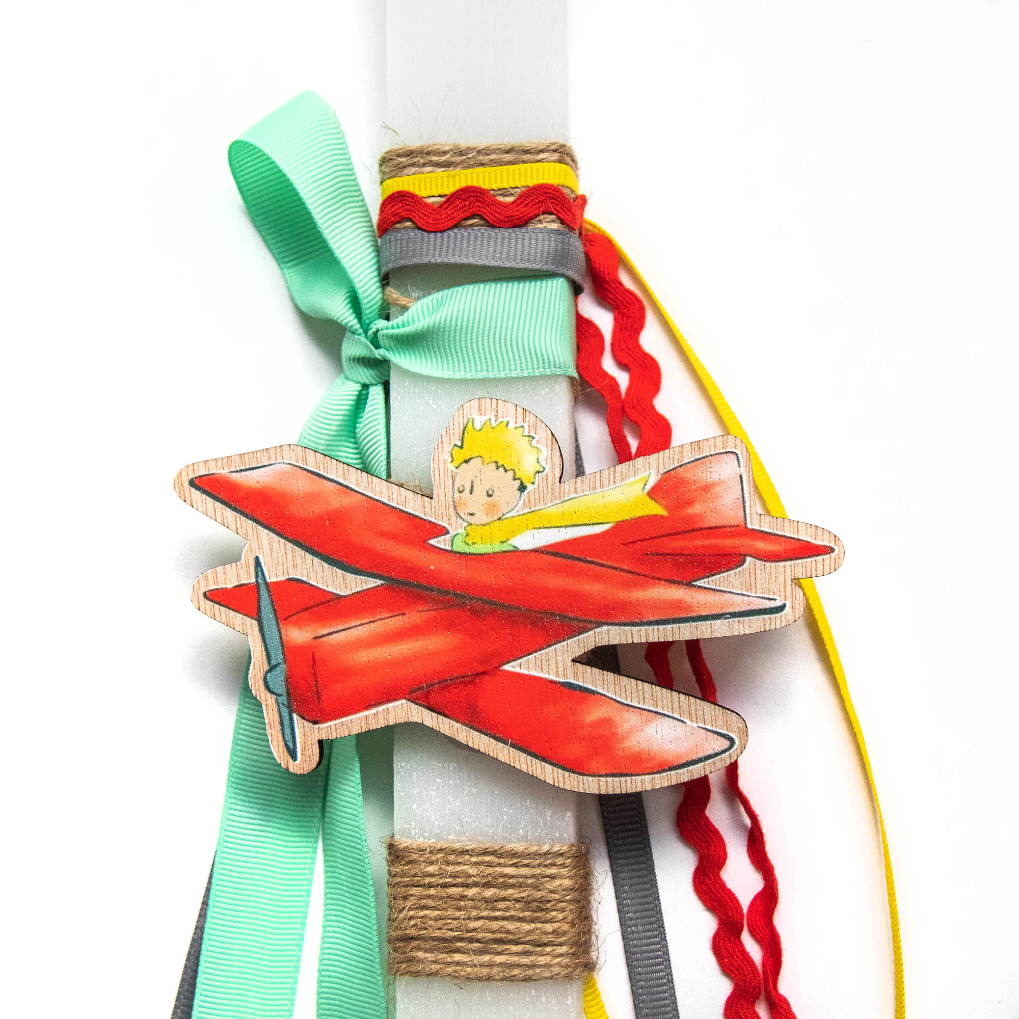 Λαμπάδα με λευκό κερί και ξύλινο μαγνητάκι μικρός πρίγκιπας με αεροπλάνο.