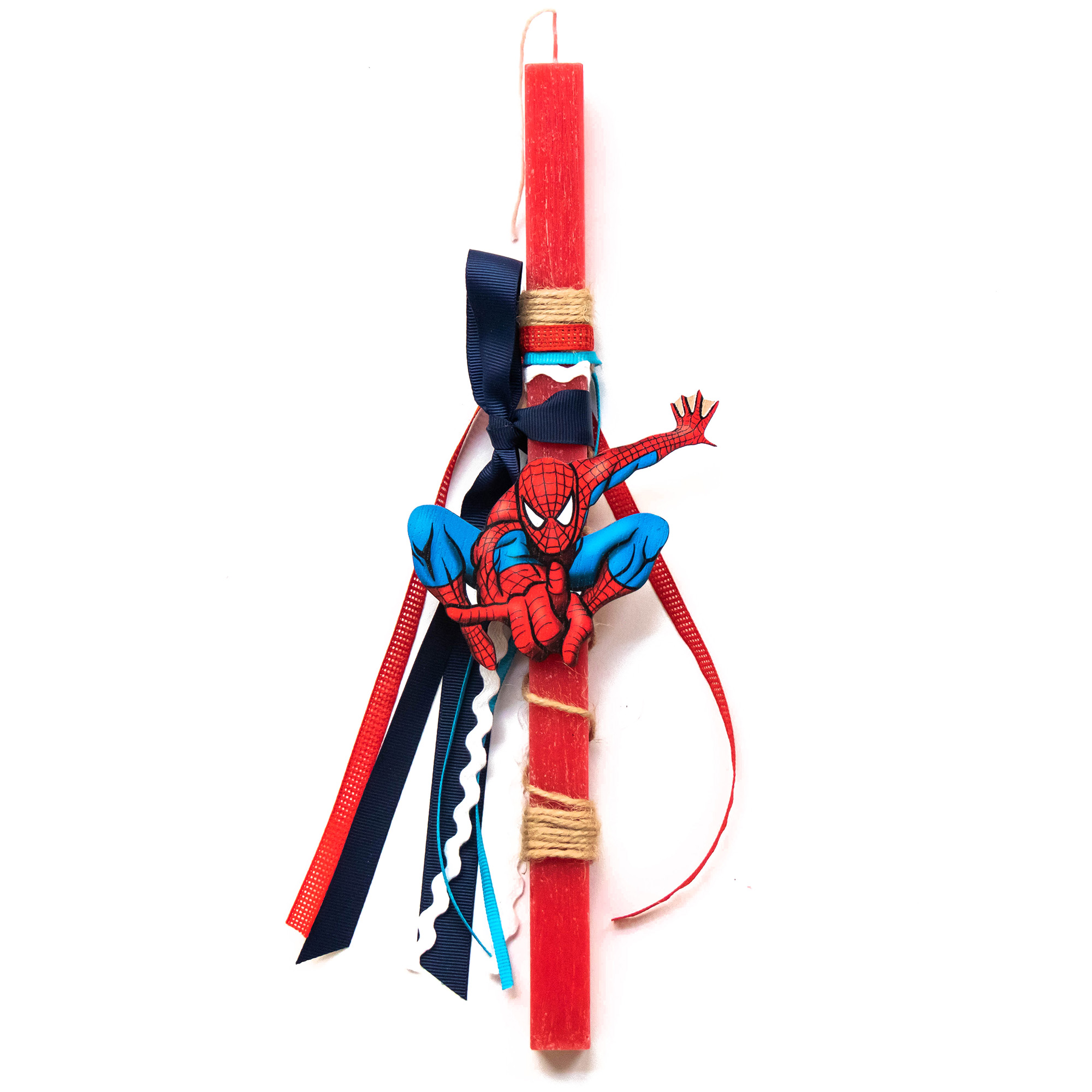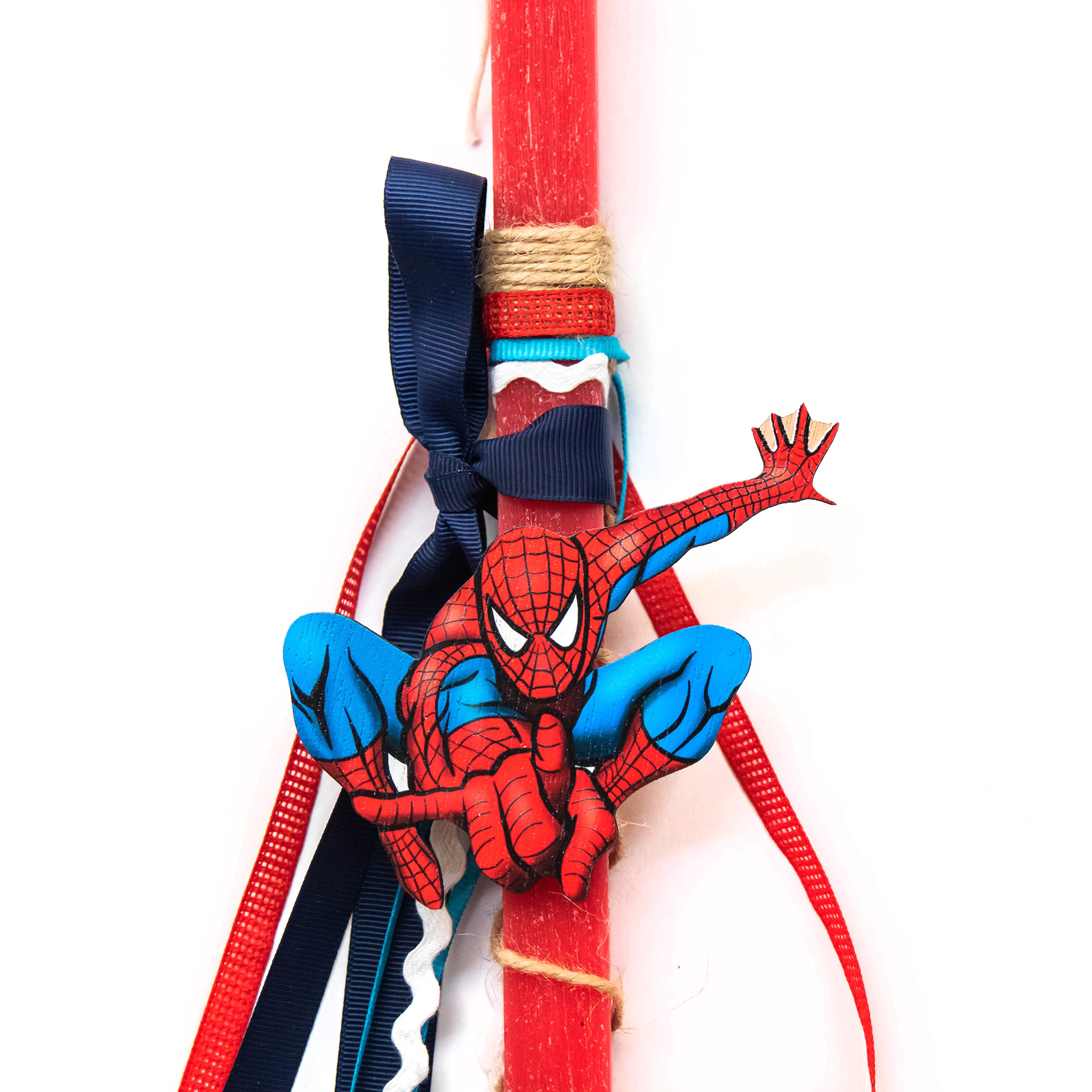 Λαμπάδα με κόκκινο κερί και ξύλινο μαγνητάκι Σπάιντερμαν.