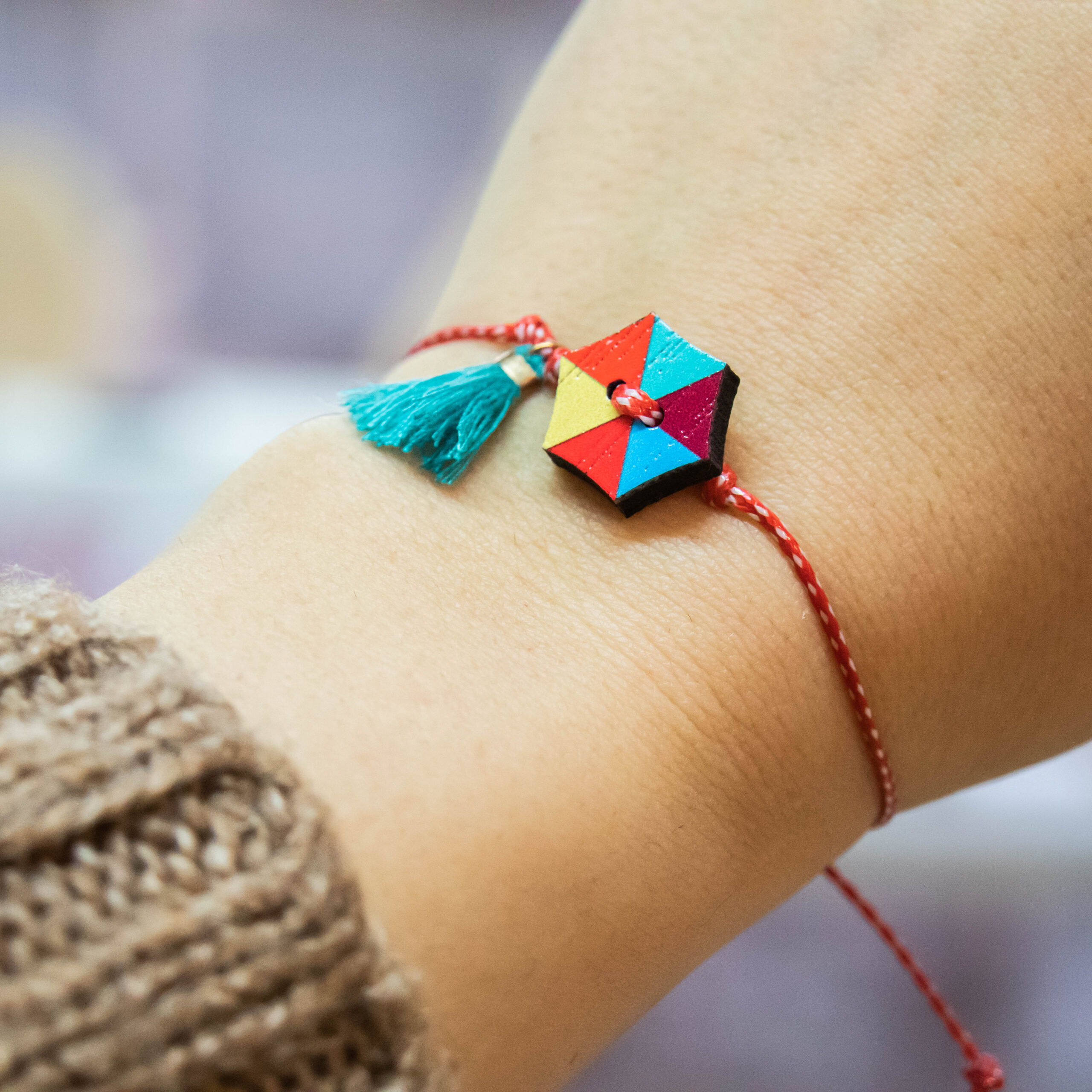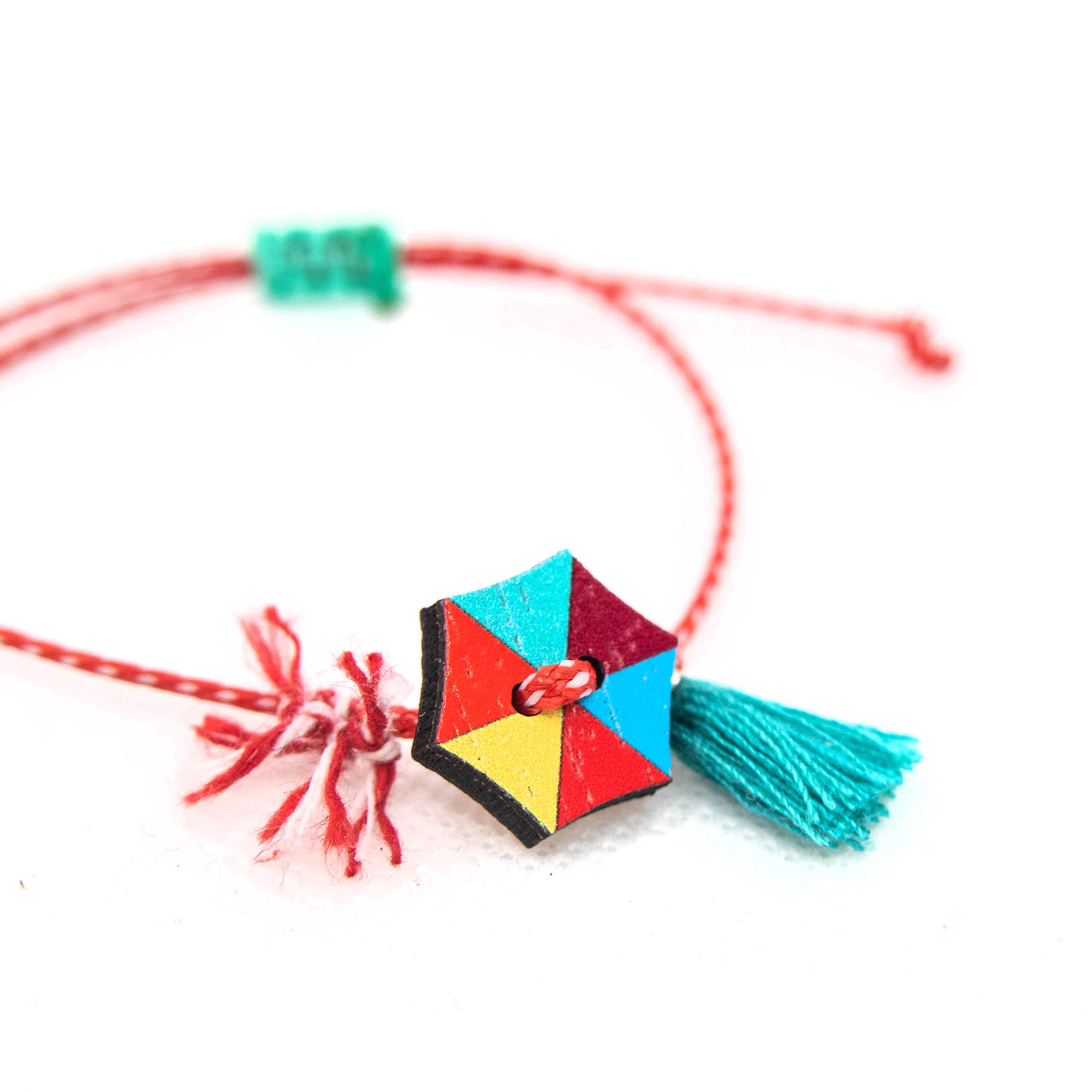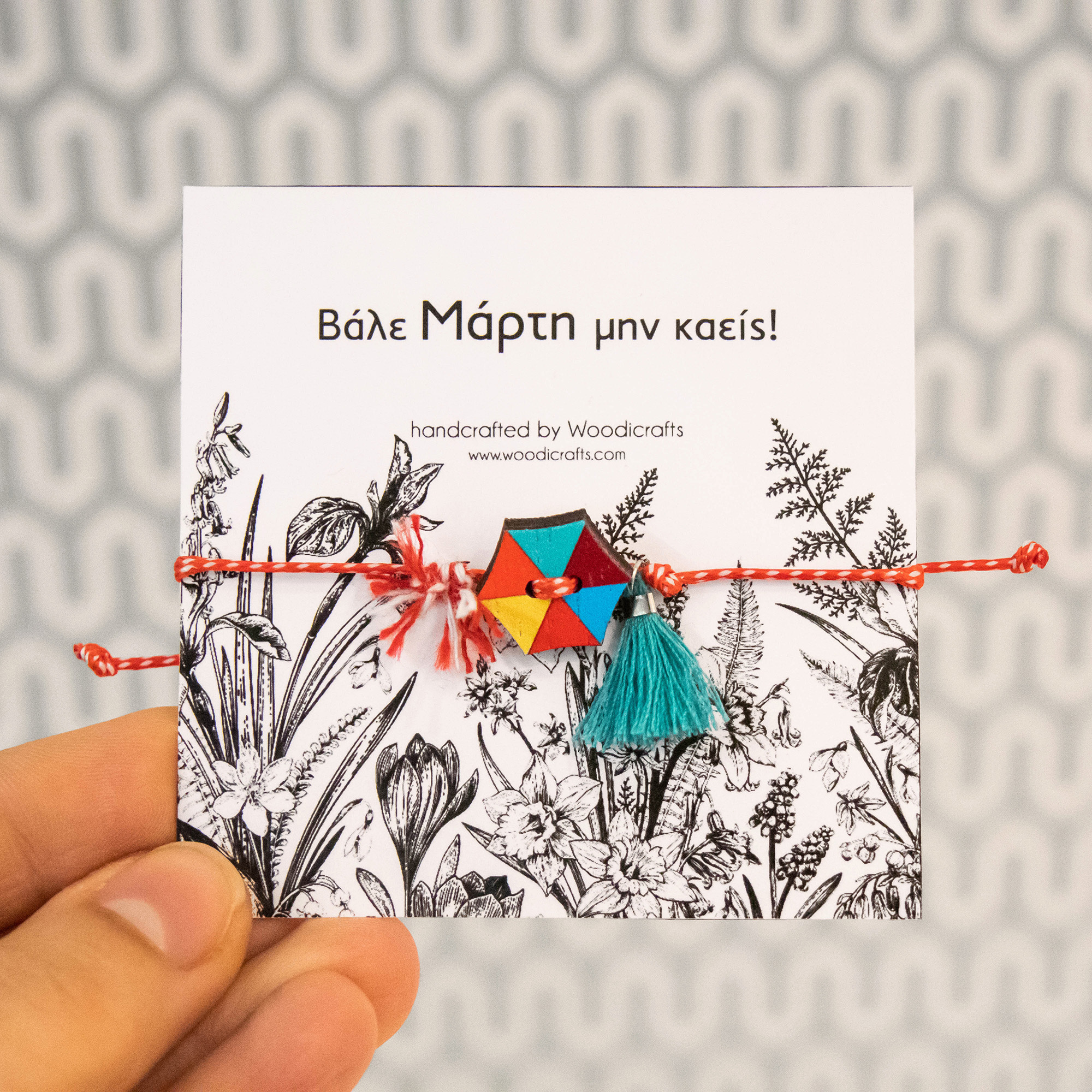 Βραχιολάκι μάρτης με ξύλινο στοιχείο χαρταετό και βεραμάν φουντίτσα. Το δέσιμο είναι μακραμέ και προσαρμόζεται στο χέρι.