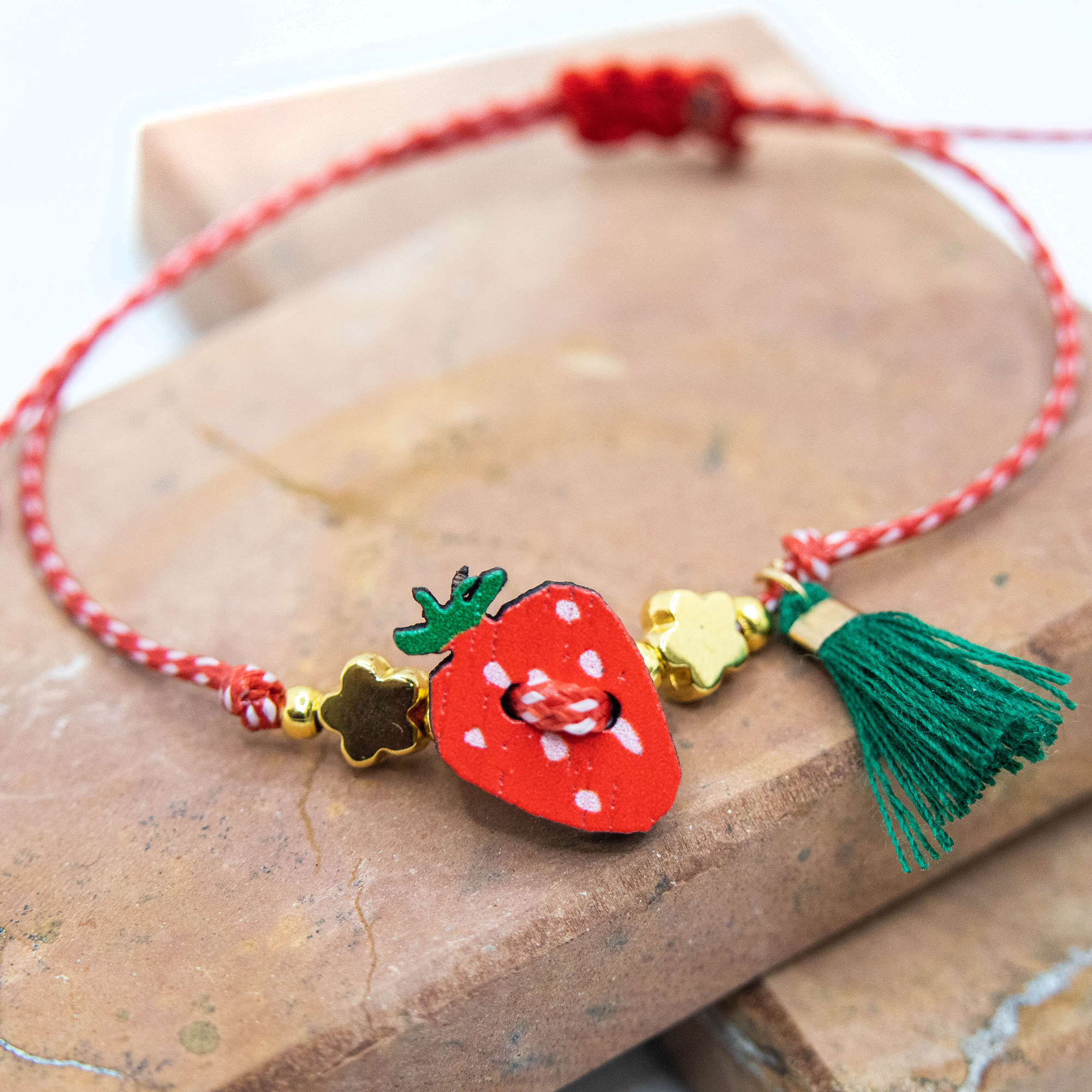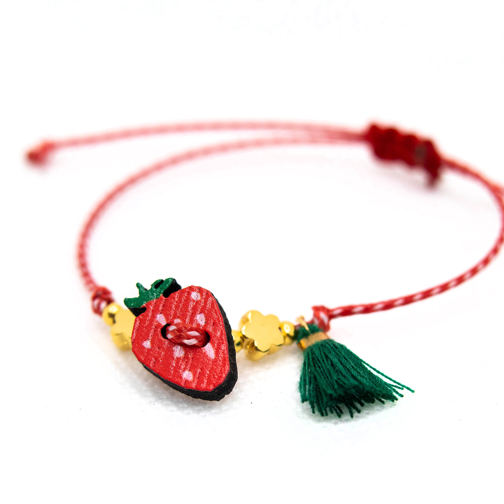 Βραχιολάκι μάρτης με ξύλινο στοιχείο φράουλα, χρυσές χάντρες και πράσινη φουντίτσα. Το δέσιμο είναι μακραμέ και προσαρμόζεται στο χέρι.