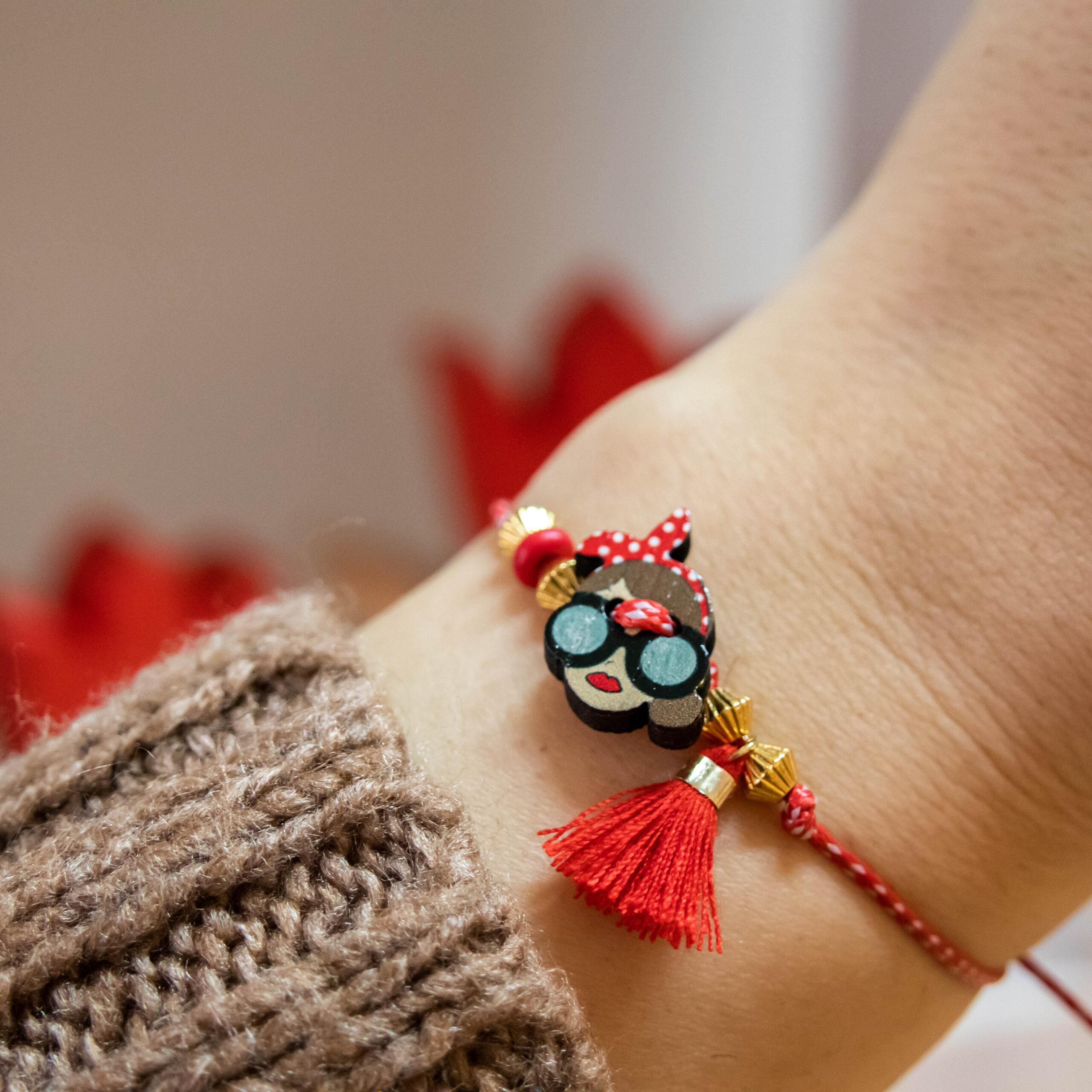 Βραχιολάκι μάρτης με ξύλινο στοιχείο, χάντρες κόκκινες και χρυσές και κόκκινη φουντίτσα. Το δέσιμο είναι μακραμέ και προσαρμόζεται στο χέρι.