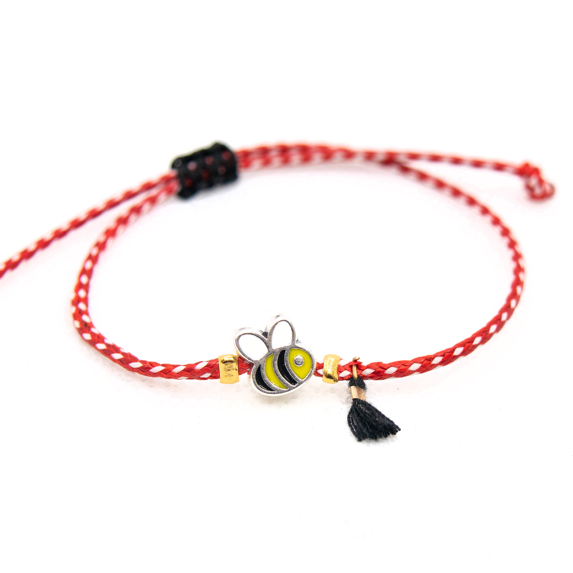 Βραχιολάκι μάρτης με μικρό στοιχείο μελισσούλα και μαύρη φουντίτσα. Το δέσιμο είναι μακραμέ και προσαρμόζεται στο χέρι.