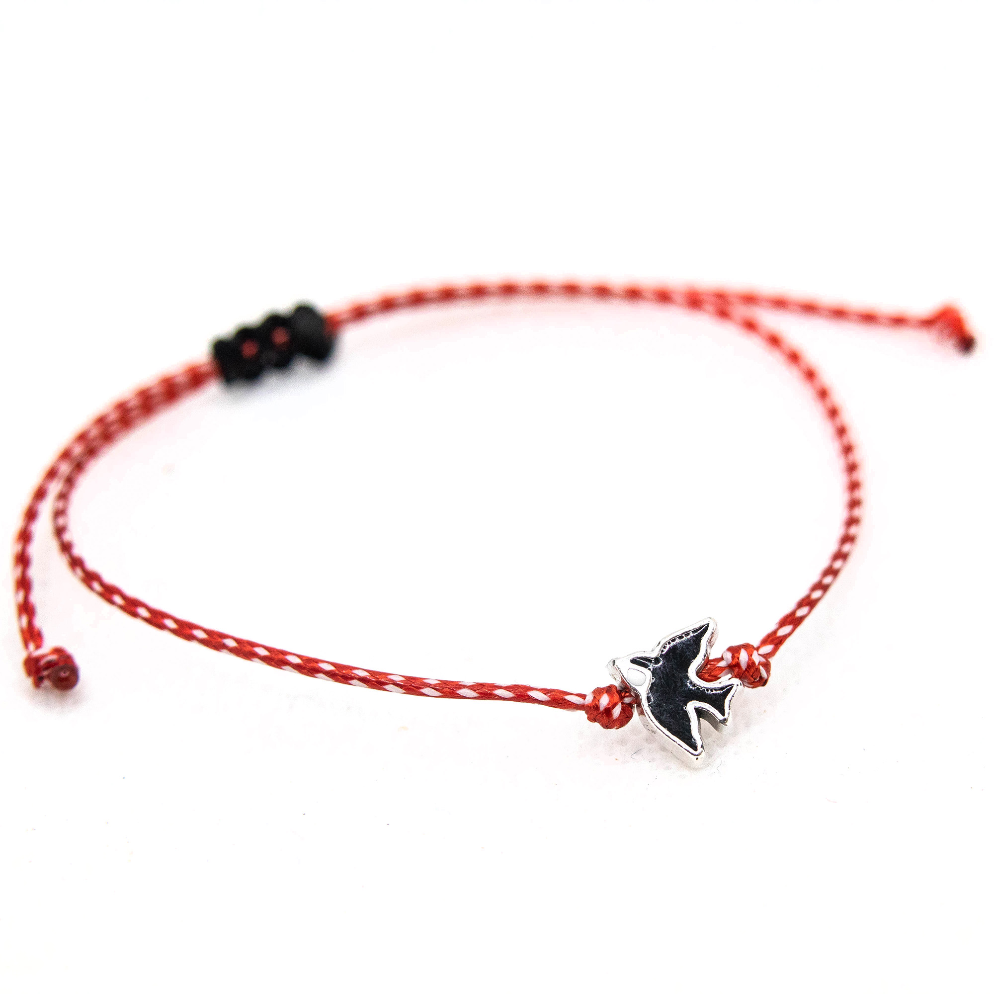 Βραχιολάκι μάρτης με μικρό στοιχείο χελιδονάκι. Το δέσιμο είναι μακραμέ και προσαρμόζεται στο χέρι.