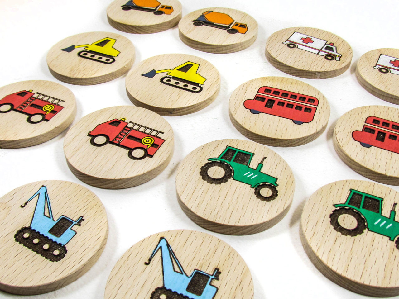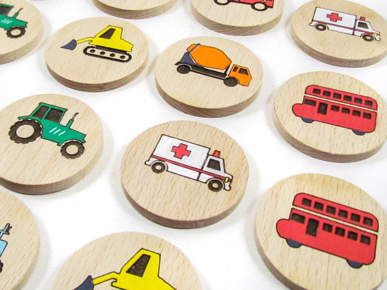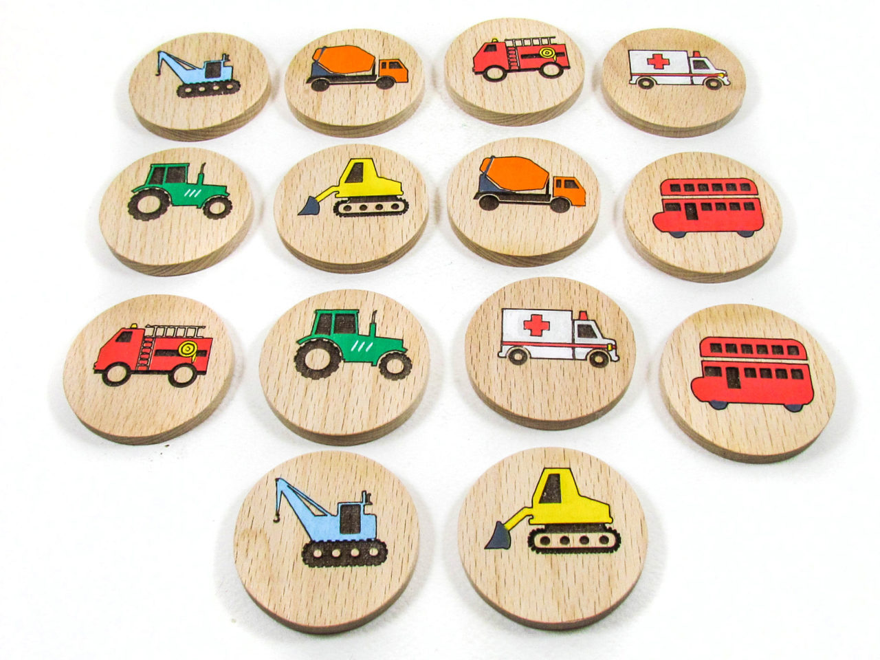 Παιχνίδι μνήμης με οχήματα. Περιλαμβάνει 7 ζευγάρια από ξύλινα πλακίδια διαμέτρου 5 εκ. Αποτελεί ένα διασκεδαστικό και εκπαιδευτικό παιχνίδι για μικρούς και μεγάλους. Ιδανικό και για ταξίδι!