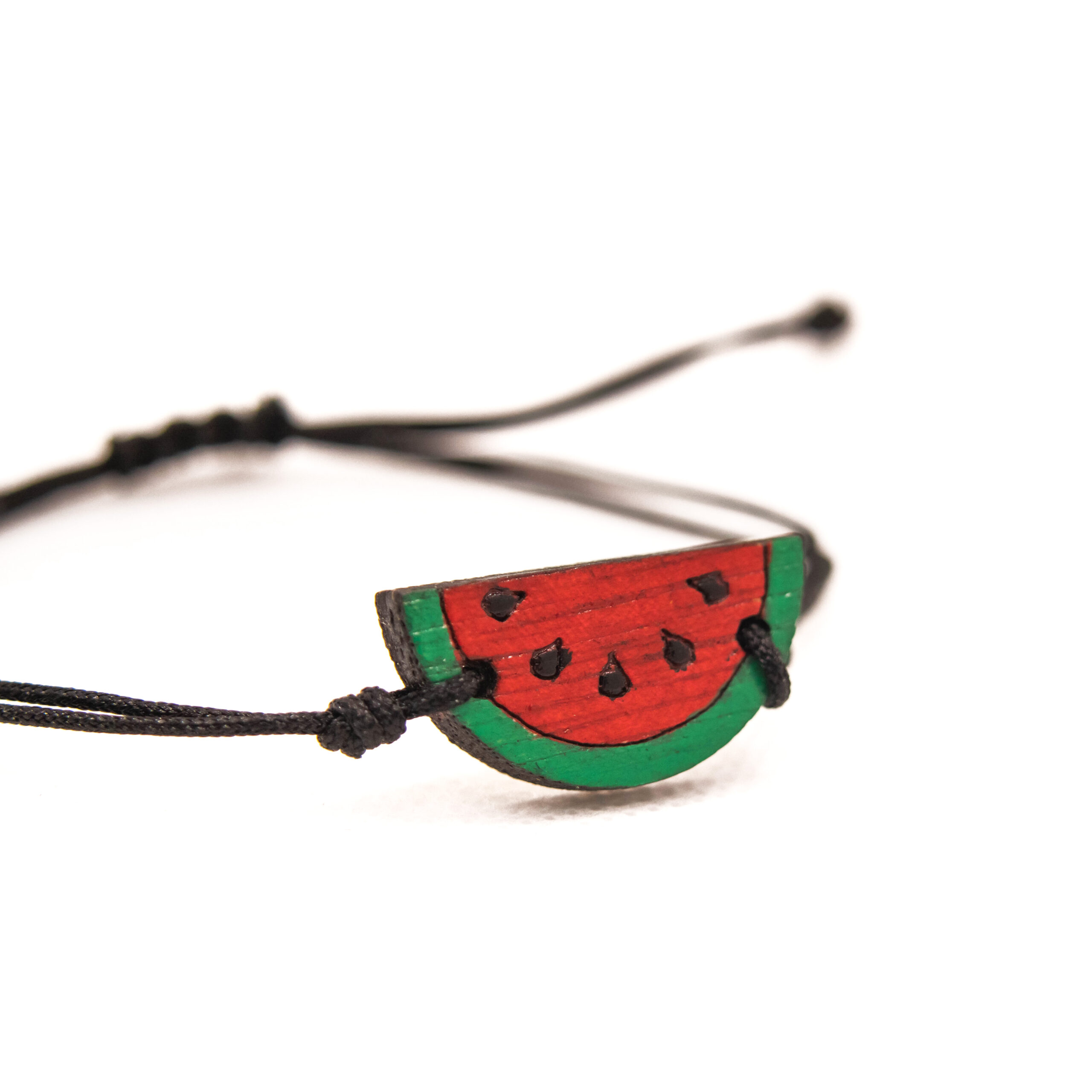 Βραχιολάκι με ξύλινο στοιχείο καρπούζι και δέσιμο μακραμέ.